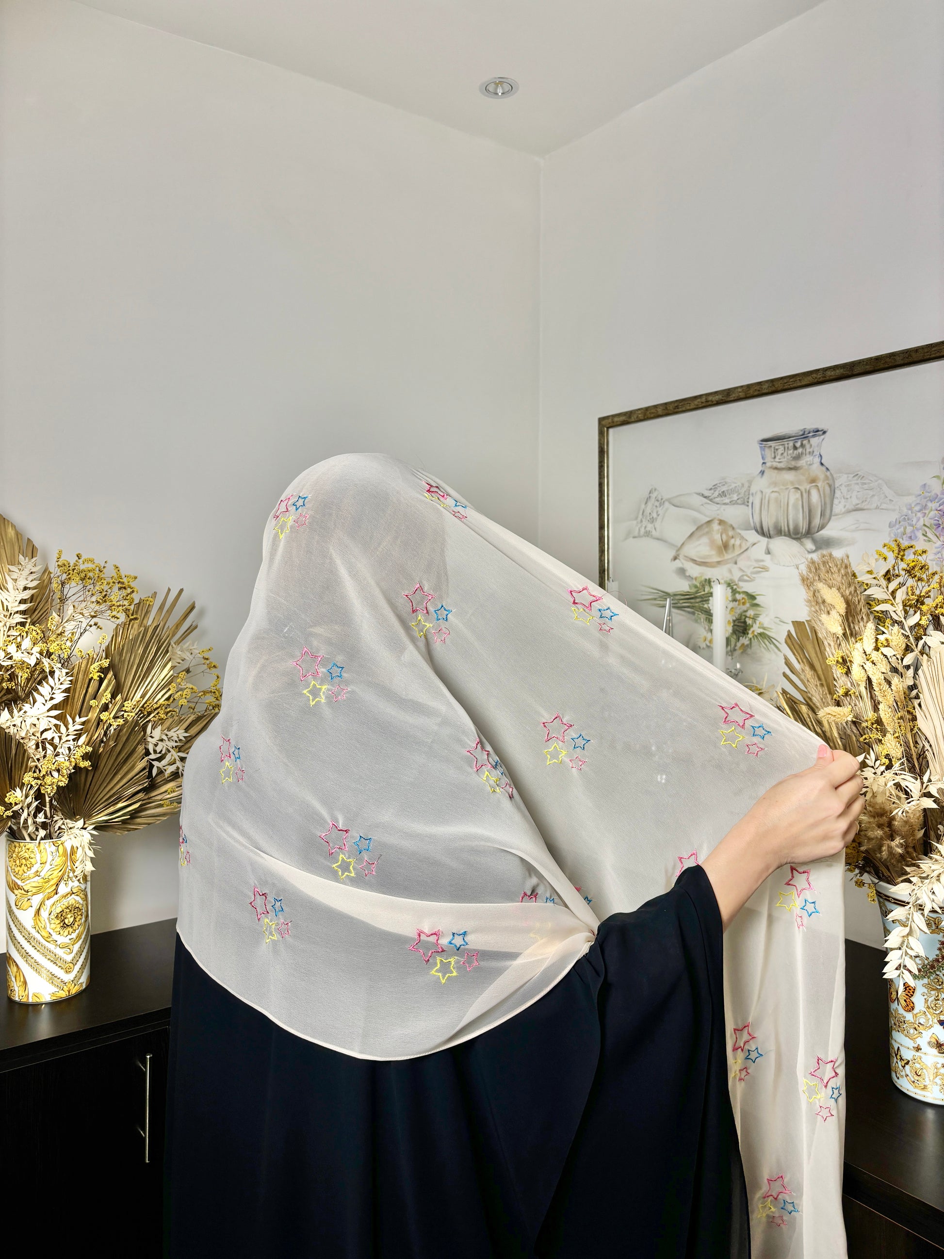 Whimsical and elegant, the Three Stars Sheila is adorned with a trio of delicate star embellishments, adding a dreamy charm to its soft, flowing fabric. Perfect for stargazers at heart, this sheila brings a subtle sparkle to your everyday or evening ensemble.